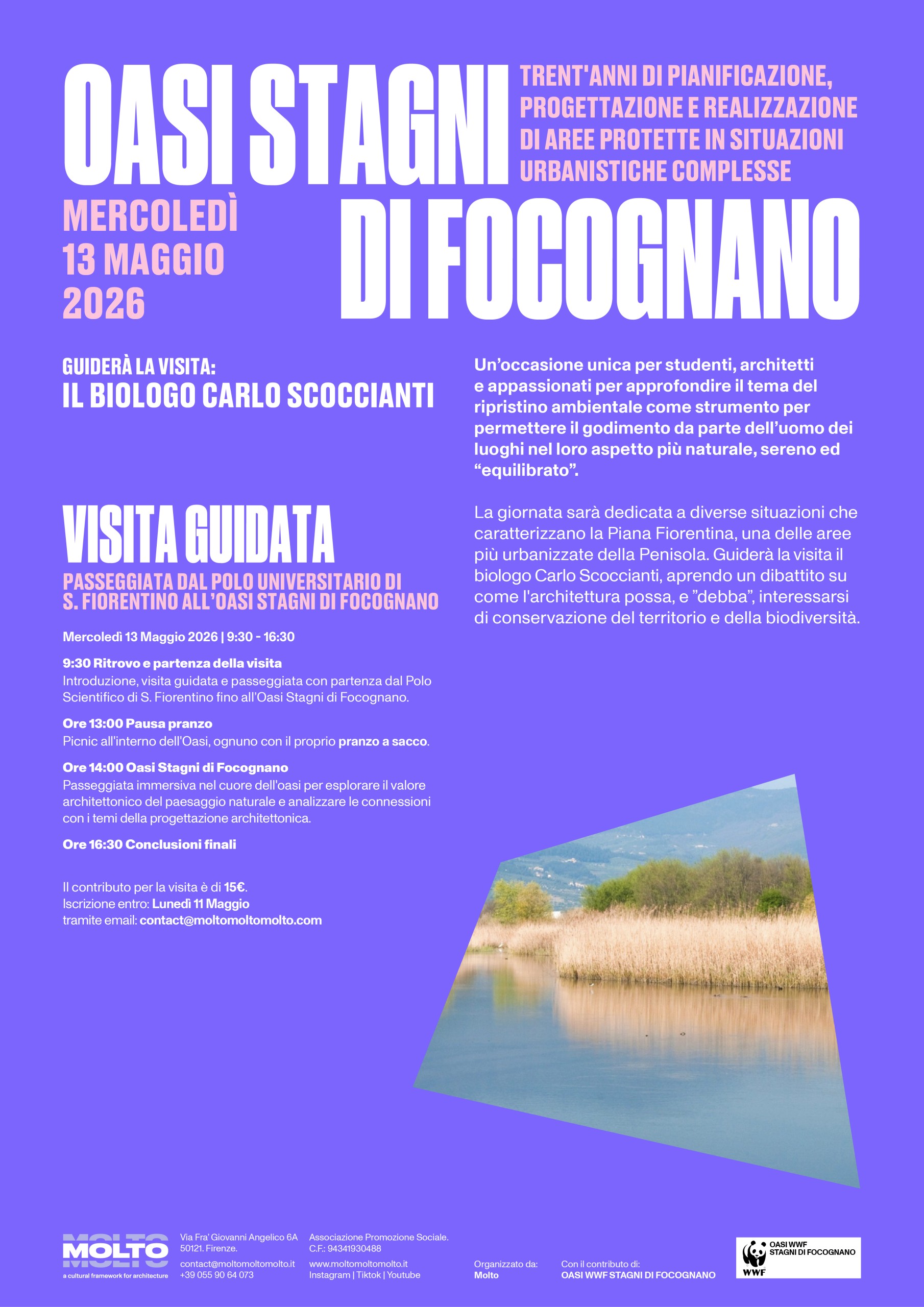La giornata sarà dedicata a diverse situazioni che caratterizzano la Piana Fiorentina, una delle aree più urbanizzate della Penisola. Partendo dalla “verifica” diretta sul campo di luoghi e/o fattori di compromissione pesante per l’ambiente e il paesaggio, si entrerà gradualmente nel “mondo” dei ripristini ambientali, toccando con mano importanti esempi di recupero di habitat e di potenziamento della funzionalità ecologica ed estetica del paesaggio. Guiderà la visita il biologo Carlo Scoccianti, aprendo un dibattito su come l’architettura possa, e ”debba”, interessarsi di conservazione del territorio e della biodiversità.
